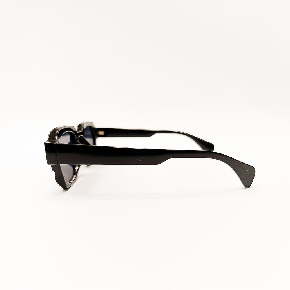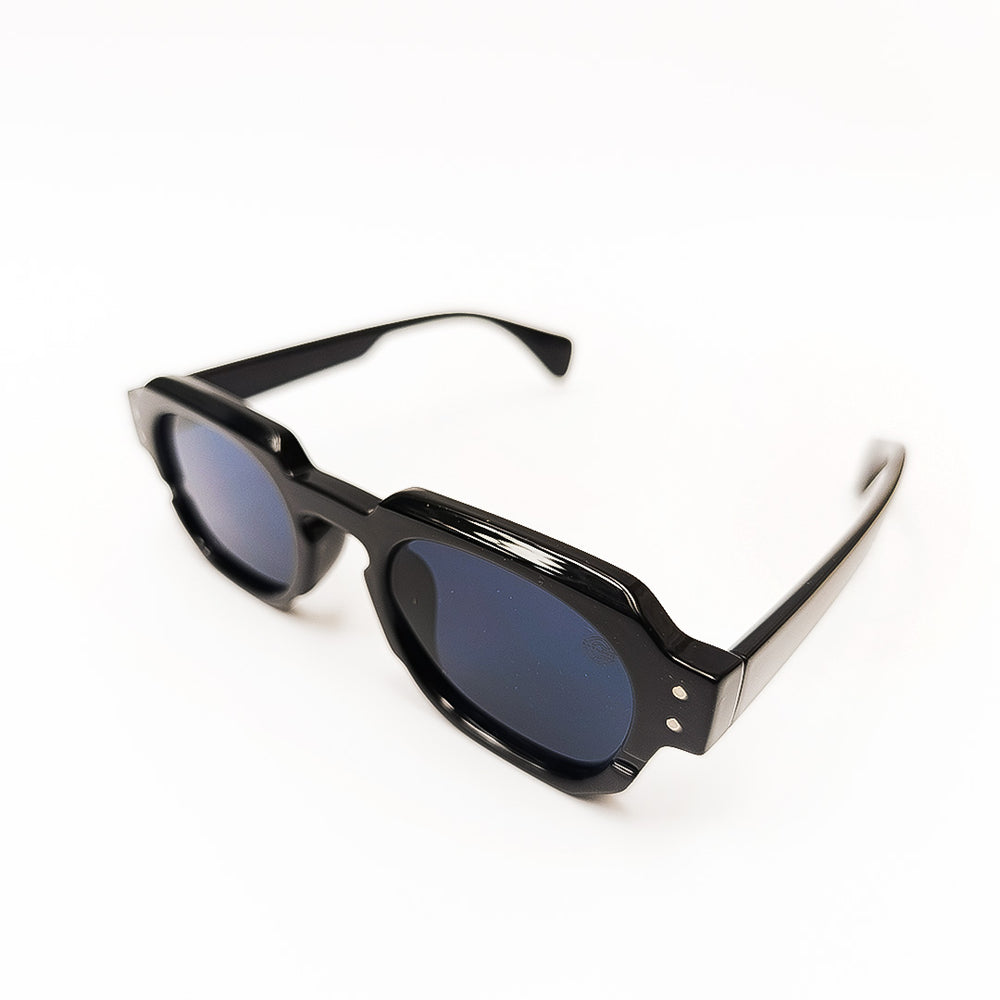 Black sunglasses with blue lenses on a white background